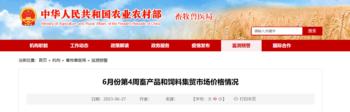 據(jù)對(duì)全國500個(gè)縣集貿(mào)市場(chǎng)和采集點(diǎn)的監(jiān)測(cè),6月份第5周(采集日為6月28日)玉米價(jià)格上漲,生豬產(chǎn)品、家禽產(chǎn)品、牛羊產(chǎn)品價(jià)格下跌,豆粕、配合飼料價(jià)格持平。生豬產(chǎn)品價(jià)格。全國仔豬平均價(jià)格33.50元/公斤...