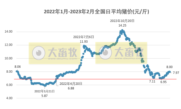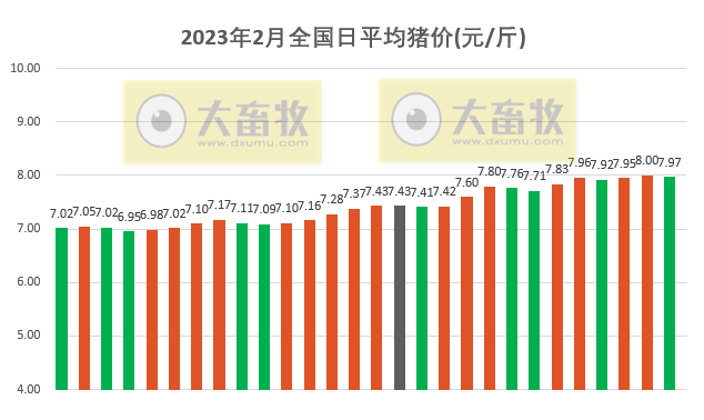 根據(jù)每日豬價計算,2023年2月高位豬價平均7.56元/斤,低位豬價平均7.27元/斤,高低位平均豬價7.42元/斤,環(huán)比減少0.2元,下降2.62%,連續(xù)4個月環(huán)比下降,累計下降44.5%;同比增加0.92元,增長14.15%,連續(xù)9個月同比增長。